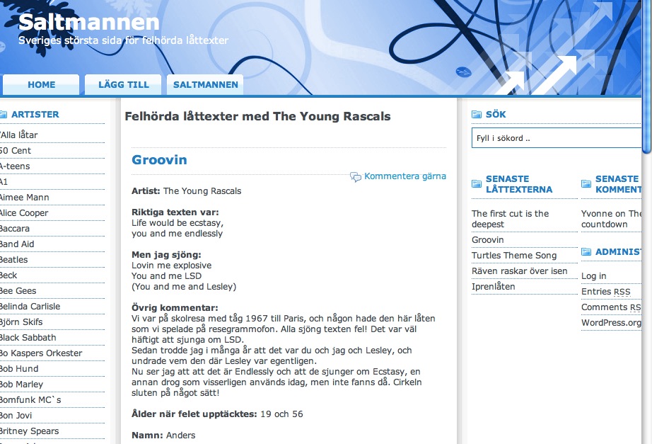 I Aftonbladet idag står det om felhörda texter. Vill du ha en helkväll, gå in på Felsjunget , en riktig guldgruva, och ta del av de mest fantastiska felhörningar du kan tänka dig! Själv har jag berättat om Groovin med LSD, Ecstasy, när The Young Rascals snurrade på vår lilla röda batteridrivna Philips skivspelare. Året var 1967. Vi var på skolresa med tåg till Paris, och någon hade den här låten som vi spelade om och om igen.