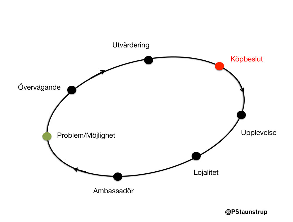Kom du ihåg köpcykeln? Den som visar olika stadier på hur informerad och redo för köp din målgrupp är. Nu är det dags att använda informationen om dina målgrupper som du tagit fram och applicera dem till varje målgrupps köpcykel. Om du valt tre målgrupper så blir det totalt tre köpcyklar.