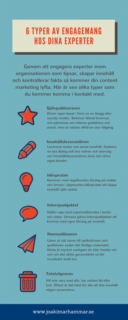 De interna experterna är otroligt viktiga för att din content marketing ska lyckas, men alla är inte lika villiga att hjälpa till. Det är helt normalt och så ser det ut i alla organisationer. Genom att förstå experternas inställning bättre så kan du få ut det mesta av alla typer.