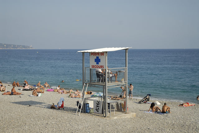 Är det inte fantastiskt med badvakter? Där sitter de hela dagen, tittar längs stranden, beredda att hoppa i och rädda dig från havets fasor. På stranden i Nice har de inte ett så stort område att spana över, men spanar gör de.