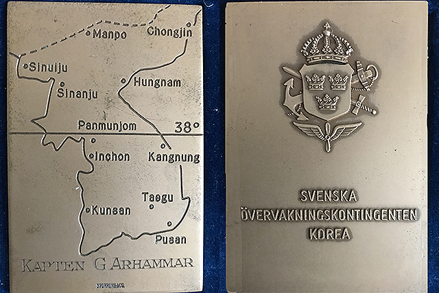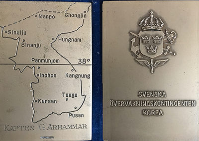 Som medlem av NNSC fick Gunnar en minnesplakett, där några av de platser han besökt finns utmärkta, Pusan med det svenska sjukhuset i söder, till Panmunjon och Manpo, på gränsen till Kina.