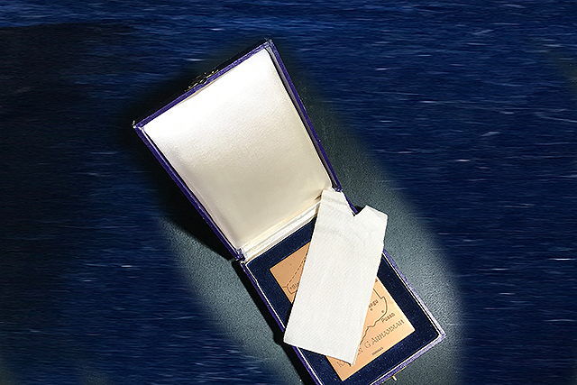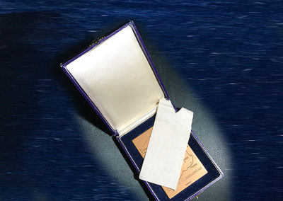 När pappa senare berättade den här historien, brukade han plocka fram en blå sammetsask, och i den låg en plakett med hans namn på, ett visitkort för ”Captain G. Arhammar” och en bit vitt sidenband, vackert ihopvikt.