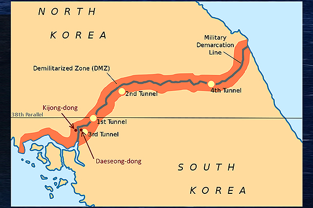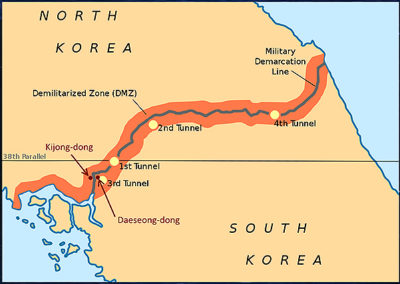 Kijong-dong och Daesong-dong heter de två byarna inom den demilitariserade zonen. Här finns också 4 Nordkoreanska tunnlar utmärkta, som byggts genom åren.