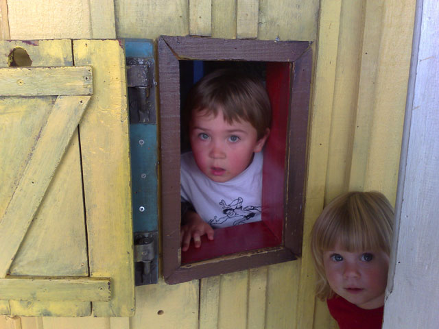När man är fem och två och ett halvt så är det mycket spring i benen. Därför är den här bilden så overklig, för den visar något som egentligen inte händer, två kusiner som är på samma ställe och tittar åt samma håll, samtidigt. Men tiondelen försvann, och bilden kommer aldrig tillbaka. Det finns ju så mycket att upptäcka på Astrid Lindgrens junibacken.