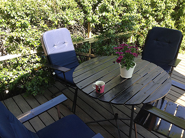 En kopp lyxkaffe på Jessi och Ristos veranda som fått friserade buskar, och senare en promenad längs Gustav den tredjes boulevard i Frösunda som på vissa ställen har en klar fransk känsla.