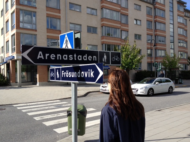De här skyltarna har plötsligt dykt upp i Frösunda, Solna. Mitt på trottoaren vid torget står de och pekar skarpt åt alla håll, precis i ögonhöjd. Varför sparar man in på höjden? Och varför mitt på trottoaren precis vid övergångsstället? Gatukontoret är underrättat, de lovade att rycka ut genast. Förhoppningsvis innan fler går rakt in i skyltarna. Men det gjorde de inte.