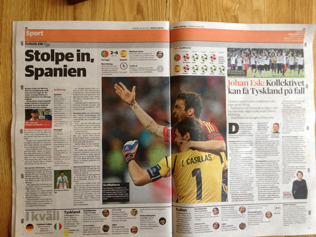 Spanien vinner över Portugal i en spännande straffläggning, och dagen efter vill du läsa om det i din morgontidning, i det här fallet Dagens Nyheter. Om du bor intill Sollentuna centrum, en knapp kilometer från tryckeriet, så hittar du ingenting om gårdagens match. Men bor du någon mil bort, i Solna, så är det bara att bläddra fram ett stort uppslag med text och bild. Här har DN ett uppenbart logistikproblem!
