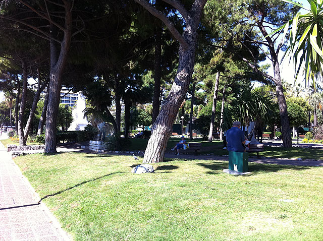 Allt är inte alltid vad det verkar vara. I den här parken i Nice, strax intill strandpromenaden, brukar många sätta sig en stund på bänkarna för att komma undan solen och njuta av trädens svalka. Här sitter också konstnärer ibland, och skissar upp sina motiv, som mannen här till höger.