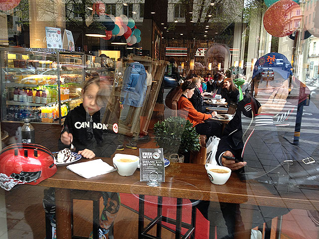 En kopp bryggkaffe med lite mjölk, en capuccino, stor, med en muffin fylld med hela blåbär och vit choklad samt en Cola zero till kladdkaka med vispgrädde och chokladsås på det. Sen blir det teater.