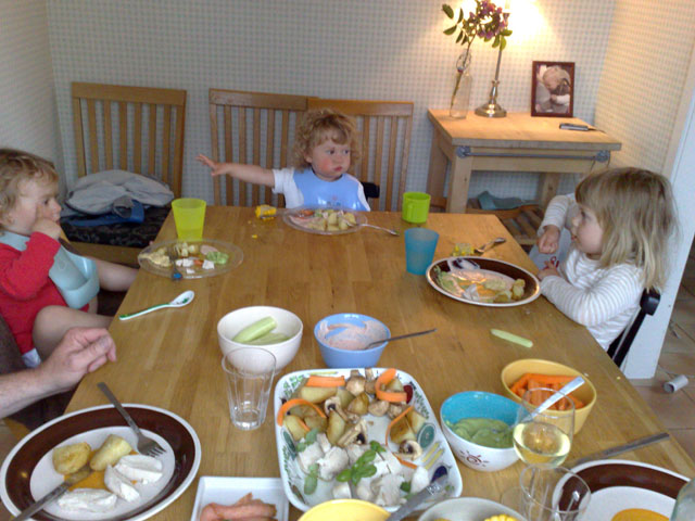 Ett matbord befolkat av småätare blir aldrig riktigt symmetriskt. All mat, hur vackert upplagd den än är, tenderar att samlas på motsatt sida, ur vägen från ivriga fingrar och lekfulla infall.