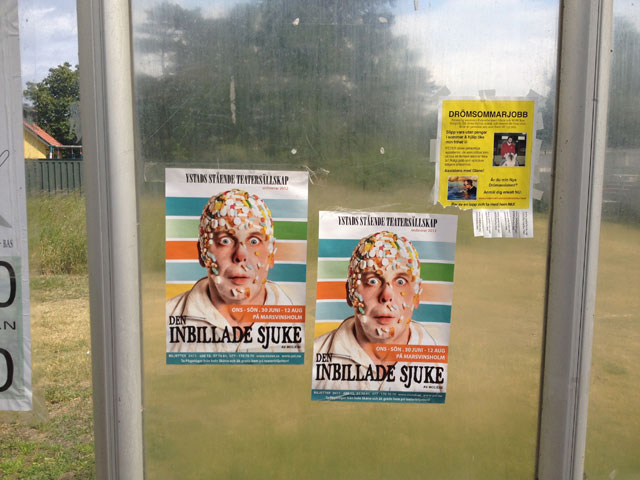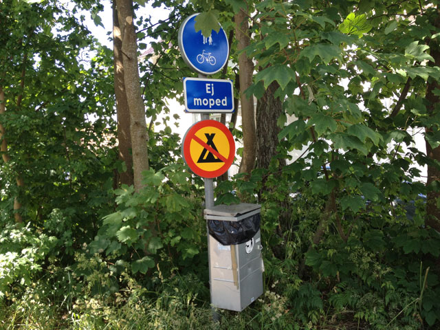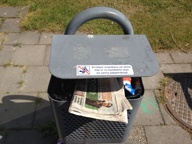 På papperskorgen invid busskuren, där en av gårdagens lästa Metro tittar fram, ombes jag att vänligen notera att det inte är en hundlatrin utan en vanlig papperskorg. En sådan som den cyklande damen nyss lade sitt tiptop glasspapper i, efter mycket stånkande och balanserande på cykeln.