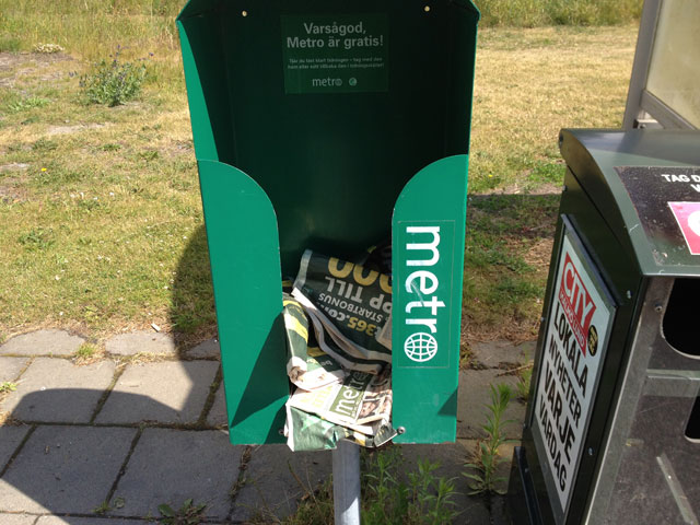 Kanske man skulle sätta en liknande skylt på Metros tidningsställ: ”Detta är inte en papperskorg”?