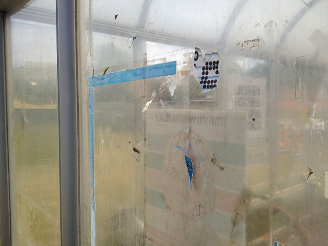 Hållplatsen på Norra Vånggatan i Falsterbo är troligen en bra plats att sätta upp budskap på, även om en av cykelkurens plastade sidor numera ligger på marken. Tejpremsor och delar från nedrivna affischer vittnar om vad som hänt.