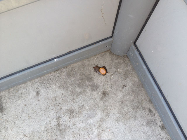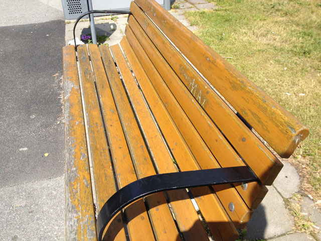 Mellan kurerna, flankerande den slitna bänken, står tre behållare. Sitter du på bänken kan du från vänster plocka en metro eller city, läsa den och sedan slänga den till höger.