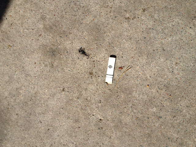 Bredvid ligger en färdigrökt fimp, Lucky Strike. Nerrökt nästan ända ner till filtret och varsamt trampad för att sluta glöda.
