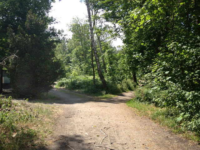 Tvärs över gatan, dit en väntande busspassagerare inte beger sig, finns hundlatrinen vid ingången till en inbjudande parkväg med ett vägskäl.