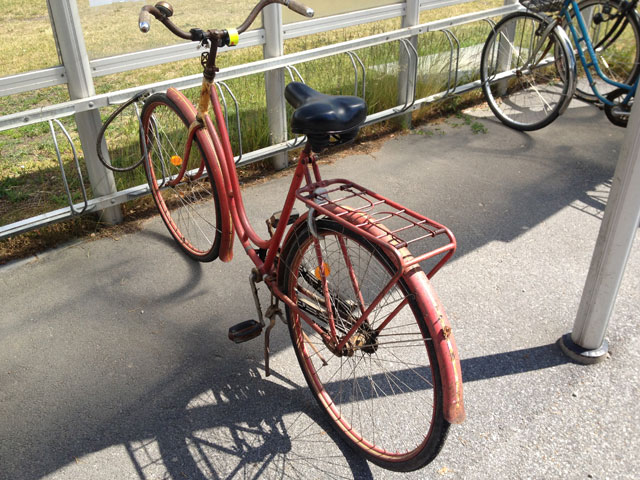 En rostig röd damcykel utan baklykta och fungerande lås dominerar, olåst men ändå fjättrad vid sitt ställ. Vi har det gemensamt, vi är fjättrade vid kuren tills någon, något, kommer och hämtar oss.