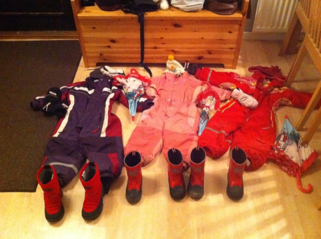 Sådärja, då är allt fixat för en snabb och smärtfri dagislämning imorgon, om det så blir översvämning och blåser småspik. Notera även de tre matchande paraplyerna samt att rätt stövel står vid rätt ben.