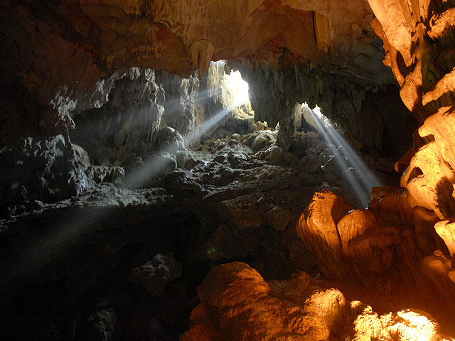 I Halong bay ligger båtarna på varandra, i väntan på turisterna som åker ut för att titta på ett fantastiskt natursceneri, med branta klippöar, flytande fiskebyar och gömda bukter som bara nås med roddbåt via låga grottöppningar. En av öarna härbärgerar en stor grotta, och i ena hörnet kan man se hur ljuset utifrån bryter in och skapar en vacker tavla.