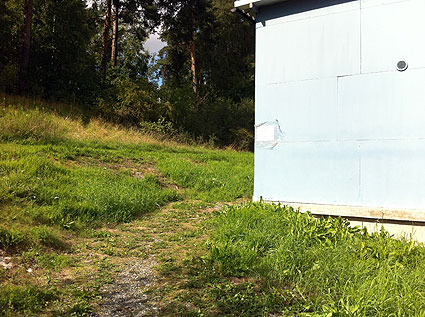 Ute i Barkarby outlet kan man gena lite, liksom gå på baksidan för att till exempel komma närmare en annan butik utan att behöva gå runt. Tydligen kan man gena för att göra annat också, för där på ett av husen sitter en vit hemmagjord lapp. Går du närmare så ser du att någon anser att det är fullkomligt förbjudet att uträtta sina behov där, och att det dessutom kommer att filmas. Och det hjälper inte om du är glad heller, det är lika förbjudet.
