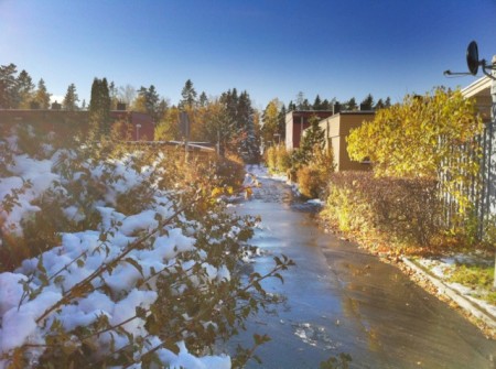 Man vet ju inte vilken årstid det är numera. Det var sommar och plötsligt massor av gula löv som nu täcks av snö. I oktober. Det kan bli en lååååång vinter.