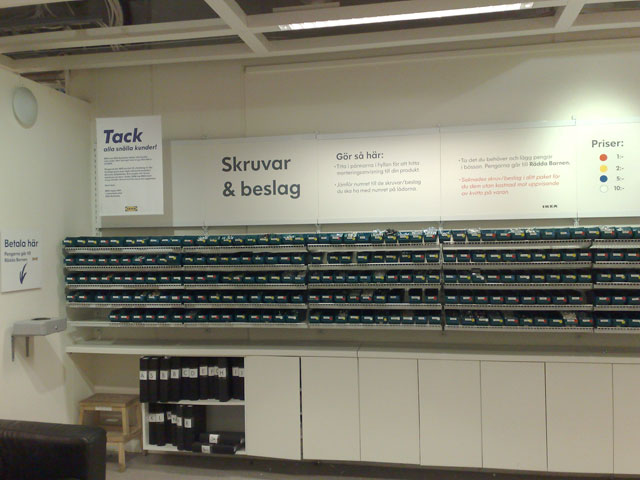 Från att ha varit ett skämt och ett exempel på att det alltid fattades något, har Ikea blivit ett mönster av kundvänlighet. Behöver man en säkring så får man en hel låda med tio stycken, så att det räcker ett tag. På kundtjänst finns en hel ploppvägg med skruvar, muttrar och tillbehör där man kan komplettera. Och kostnaden är överkomlig, det räcker med att lägga en slant i en insamlingsbössa till barnbyarna. Ett riktigt föredöme, i alla fall när det gäller kundkontakter.