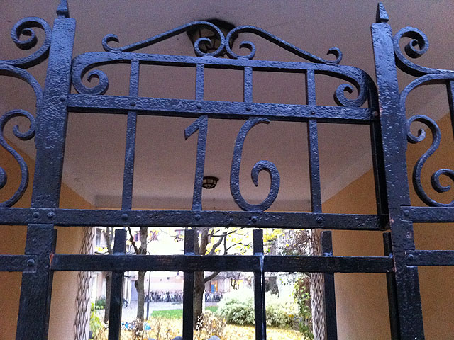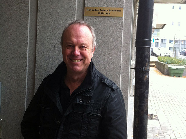 1. I porten sitter en guldplakett med ”Här bodde Anders Arhammar åren 1952-1958”.