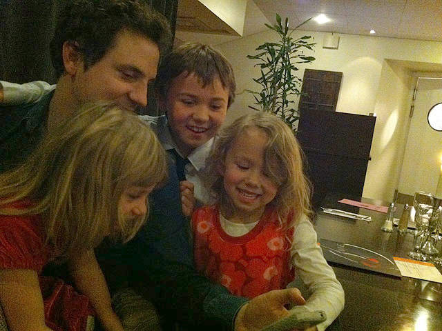 2. På hotellrummet ligger presenten, vi sjunger och spelar lite tillsammans och skålar i champagne.