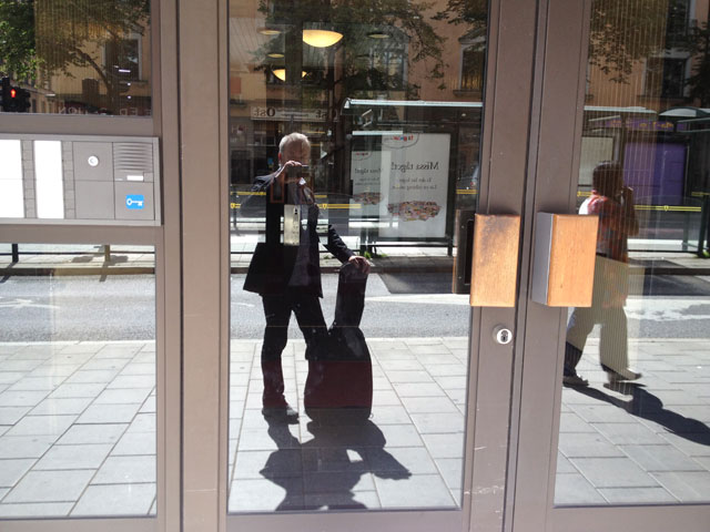 Jag hade lånat ut min gitarr till en kompis och efter väl förrättat värv fick jag den tillbaka. Så, när jag gick förbi ett skyltfönster på vägen hem med min gitarr såg jag vad jag för en sekund trodde var en annan gitarrist på väg åt samma håll. Men det var förstås bara min egen spegelbild. Jag gillade hursomhelst det jag såg, det såg ut som om jag hade roligt så jag tog en bild. Den tänker jag titta på lite då och då när snön yr som värst och det stora höstgrå lindar in världen alltför hårt. Då finns det ett spegelfönster att titta ut genom och jag tror man mår bra av att ha såna fönster i livet.