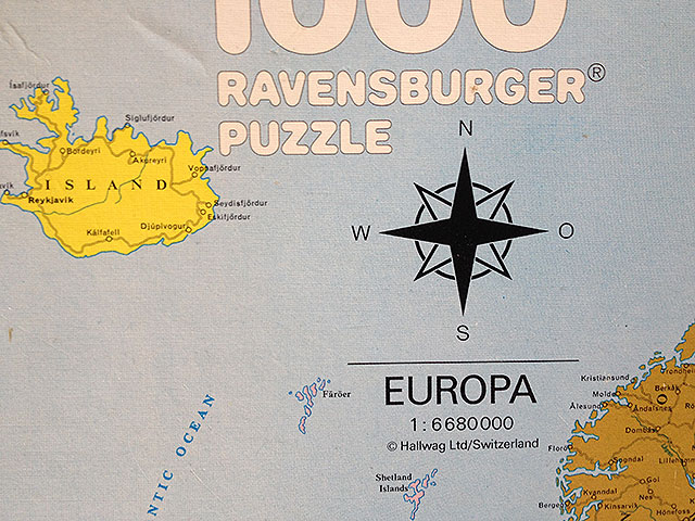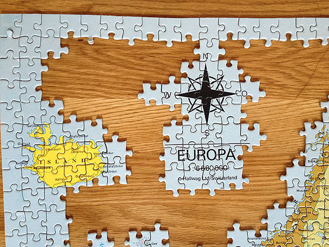 Nu har man kommit till slutet av Europapusslet. Det är visserligen från den tiden då det inte fanns så många länder att hålla reda på, men ändå. Städerna ligger ju där de ska. Här har jag lagt upp de tråkiga havsbitarna i sina former, som man ska göra. Gubbpluttar med huvud för sig, utan huvud för sig, liggande H och stående H för sig samt de knepiga för sig. Inget konstigt. Sen är det bara att scanna konstiga former, och till slut köra alla bitar på samma plats tills en faller i. Som man ska göra.