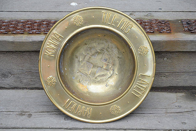 Jo, det visste Berit Fransson, som med hjälp av en inventarielista kunde plocka fram den för fotografering. Efter snart 62 år är jag åter vid den gamla dopfunten med tillhörande dopfat, och kan konstatera att fatet verkar vara gjort av mässing och inte ärgad koppar som det stått i något dokument som passerat mina ögon under min två år långa jakt.