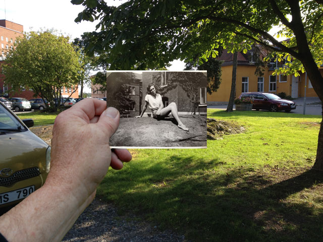 Jag har sen en tid tillbaka tagit gamla bilder och fotograferat av dem i samma miljö som då, fast nu. Ofta går det bra, man hittar en sten, ett träd, ett hus, en bro som hjälper till att visa var den gamla bilden är tagen.