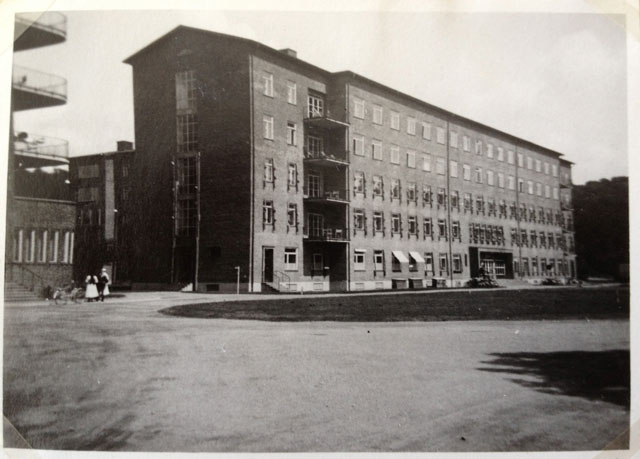 Här är ännu en bild som jag inte kan hitta den rätta vinkeln för, Karolinska 1946 omkring. Den passar ungefär på flera byggnader, men inte riktigt. Balkongerna i förgrunden har jag hittat ungefär, men inte riktigt. Så jag tar en tur då och då och funderar över var huset kan ha gömt sig. Nog är balkongerna till vänster på bilden ovan rätt lika på bilden nere i alla fall?