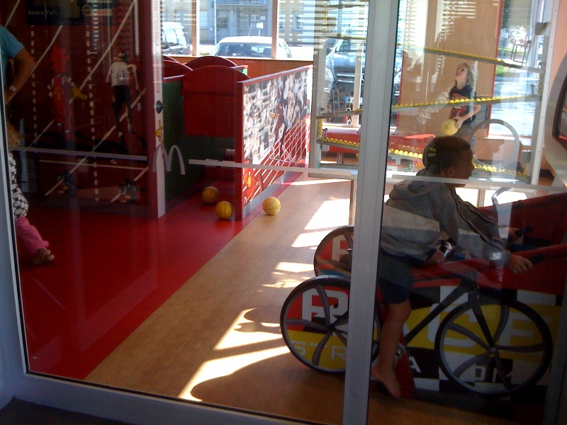 Först tyckte jag det var jättebra. Mc Donalds satsar på att barnen ska bli jättesunda genom att springa och leka av sig allt fett de får i sig på hamburgerrestaurangen. Men sedan har jag förstått att tanken med lekhörnan är att barnen ska bli hungriga igen, och köpa ytterligare ett meal eller något annat. Snacka om att slå två flugor i en smäll och äta burgaren men ändå ha den kvar. Dubbel nytta med en dold agenda, det borde gå att tillämpa på alla möjliga sätt.