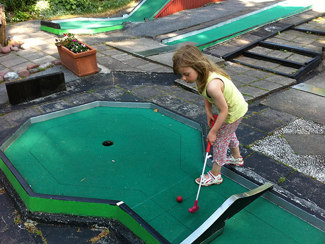 Det är första gången Mira spelar minigolf. Vis av erfarenheten bereder jag mig på att trösta för de dåliga resultaten och peppa att det är roligt och inte så viktigt och framförallt, att det inte alltid är så lätt med minigolf. Utan att sikta eller någonting sopar hon iväg på den första banan. Två slag i hål.