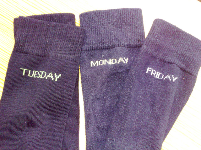 Till detta ett par strumpor med Saturday invävt en bit upp på vaden. Och det är strumporna som jag är mest nöjd med. Jag har numera bara svarta dagstrumpor, i två uppsättningar, och har gått från att bara ha högerstrumpor liggande i byrålådan, till att alltid ha ett matchande par. De representerar dessutom, på grund av alltför intensivt användande av tvättmaskin, ett spektrum av svartnyanser. Man kan välja allt från deppgrått till festsvart. En måndagsstrumpa har tyvärr gått sönder, men matchas enkelt med en fredagsstrumpa som förlorat sin partner vid det senaste badhusbesöket. Tres Chique.