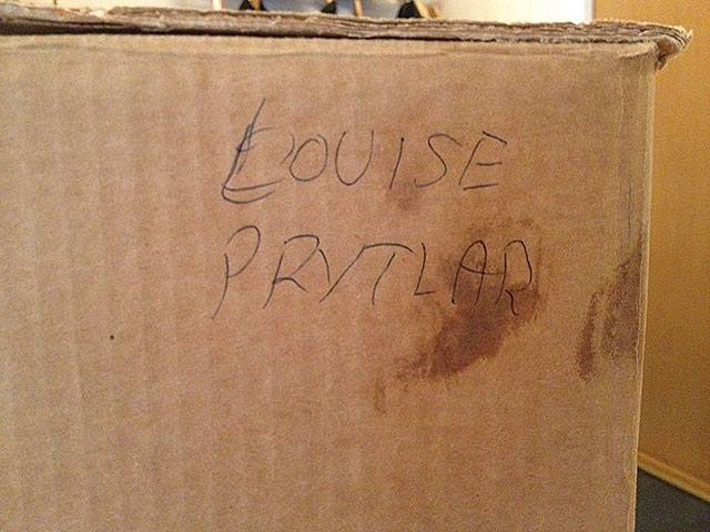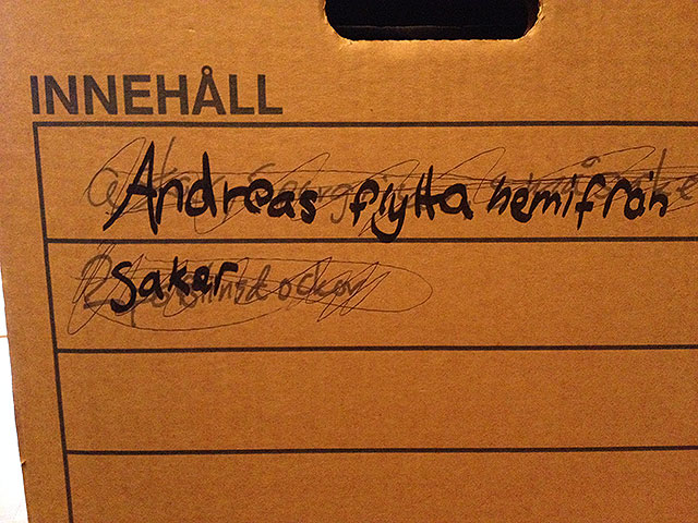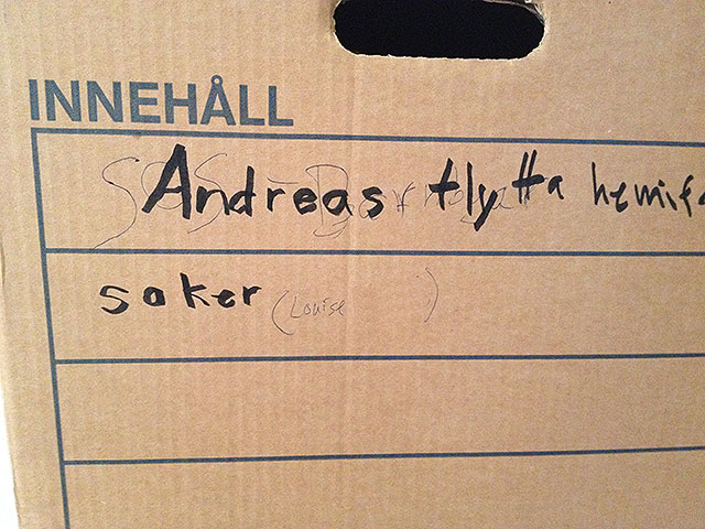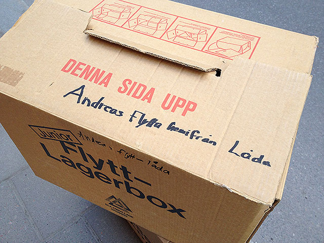 Andreas har nog flyttat hemifrån, för här på Humlegårdsgatan i Stockholm står lådan som han använde. Kanske var det hans mamma som fyllde den åt honom, kanske en storebror eller en morfar. Eller så har han haft den stående i garderoben och pytsat in lite grejer då och då. Men den kan inte ha stått så länge i garderoben, för den har också inrymt Louise prytlar, adresserats till SOS barnbyar samt troligen skyddat 2 porslinsdockor, småsaker och något urblekt som borde aktas. Man kan tycka att lådorna har gjort sitt, men nu står de här vid ännu en trottoarkant, fyllda med någons drömmar och begär. Efter ännu en uppackning säljs de snart åter på blocket för 10 kronor styck och viks ihop för en ny leverans.