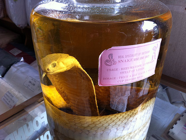 Nej, jag blir inte sugen, hungrig eller törstig. Det ser ut att vara en delikatess men jag gillar inte mat som stirrar på mig. Inte ens om det är bra mot reumatism, som det står på flaskan. Det står något på vietnamesiska också. Jag kan inte vietnamesiska men antagligen står det “Släpp ut ormen och du kommer att springa fort hur ont du än har”.