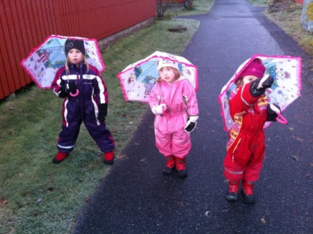 Inte för att det regnar, men paraplyerna ska med ändå. Och trots intensiv planering råkade vi ändå glömma en leksaksbil i plast, en mycket viktig ingrediens i dagisgåendet. Utan bil – ingen rörelse. Efter bilhämtning gick patrullen vidare. Även små människor vill ta bilen till jobbet.