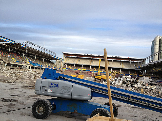 Och där, bakom det höga blå planket, försvinner gamla Råsunda bit för bit. Sträcker man sig riktigt långt så kan man ta en bild över huvudet och se vad som finns kvar.