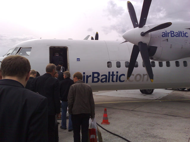 En exceptionellt bekväm nedresa, det kan ha varit en MD-90 med två stolar i varje rad, byttes till sin absoluta motsats när vi fick äntra denna Fokker 50. Förutom en betydligt längre flygtid, så fick man insomnade ben, kokhet och fullsatt kabin, inklämd kropp och en guppigare färd.