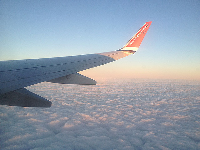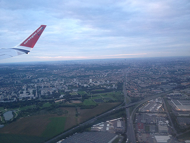 Den sista dagen i Paris, lång promenad och väntan inför kvällsflyget. Så lyfter vi mot Stockholm och därnere skymtar Eiffeltornet. Till vänster är det solnedgång över alperna, och till höger ett tussigt soltäcke bort mot öster.