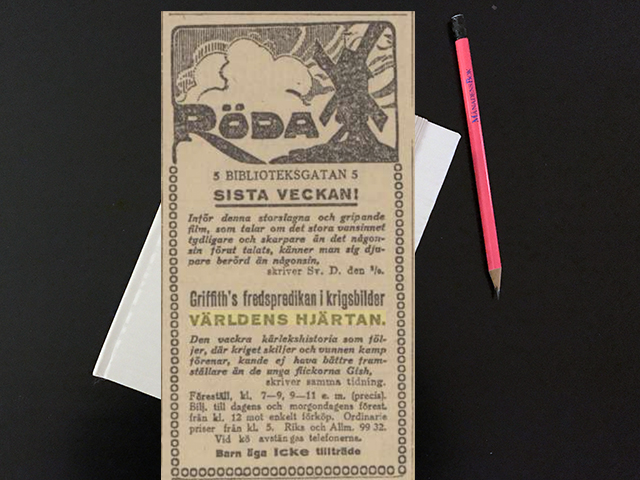 Så sågo vi en kväll på Röda kvarn “Världens Hjärtan”, Griffiths stora fredspredikan. Den var verkligen gripande med de mest hjärtskärande scener. Lily och Dorothy Gish samt Harron briljerade i huvudrollerna med ett verkligt realistiskt och fängslande spel. Fem dagar stannade Kalle hos mig, så måste han resa igen. Tidigt på tisdag morgon. Så vi togo adjö på måndagskvällen här hemma. Det var så sorgligt, att jag grät. Stora tårar.