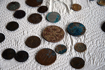 Den gröna färgen på silvermynten gick att peta loss om man pillrade lite, men den ärgade kopparn var ett värre problem. Dock finns det en lösning, både för mynt och andra kopparföremål.