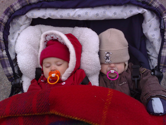 Här ligger dom, olyckligt ovetandes om att det är deras alldeles egna tårtdag idag. Deras alldeles egna första presentöppnardag. Första kalasdagen, och hitintills är kalasbyxorna det närmaste de kommit en firning. Men eftermiddagen blir bättre, då blir det luciasång och haddenäran i kubik, för storasyster får lite hon med. Så det går bra att sova en stund till.