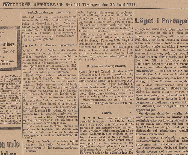 Under gårdagen förekom föredrag av professor K Kjellberg om ”gamla och nya kulturvärden” och af mr J Fields om georgismen samt af komminister H Halén. Mötet var besökt av omkring 5 000 personer. Man beslöt avsända ett hälsningstelegram till den svenska ungdomen i Finland.