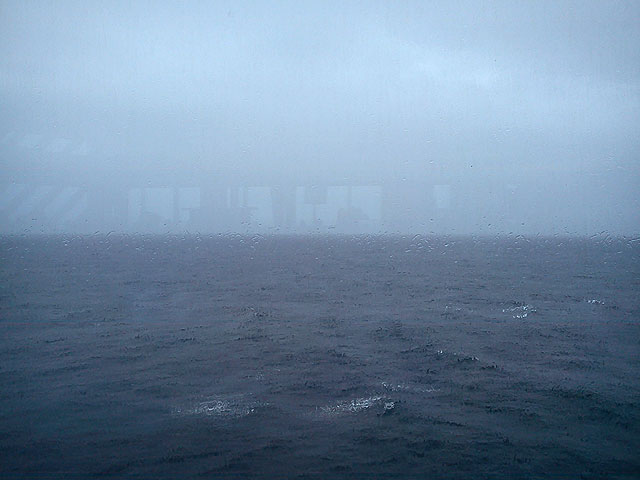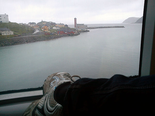 Hurtigrutten calling. Nyss lämnat Honningsvåg, stan närmast Nordkap. Vi har hytt 600 vilket inte kan sägas vara det bästa fartyget har att bjuda. Hytten ligger liksom runt hörnet, om ni fattar. I baren på däck 8 passerar omgivningen revy. Det är färgen grå. Ute är det väl 6 grader, kanske sju.