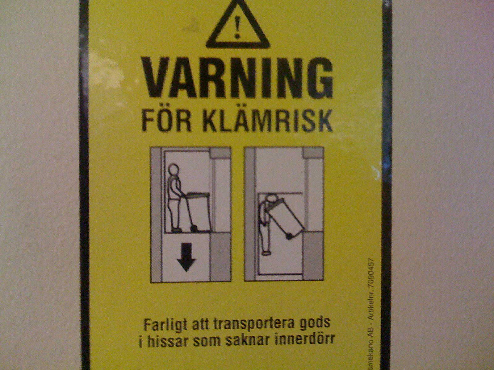 Det är först när man stiger in i hissen, som man ser hur farligt det är. Det är så dags då! Som tur är gick det bra den här gången, men nästa gång går jag nog i trappan. Om det inte finns en skylt i närheten som visar på att man kan halka nerför alla trappstegen förstås, och klämmas på motsvarande sätt fast neråt.
